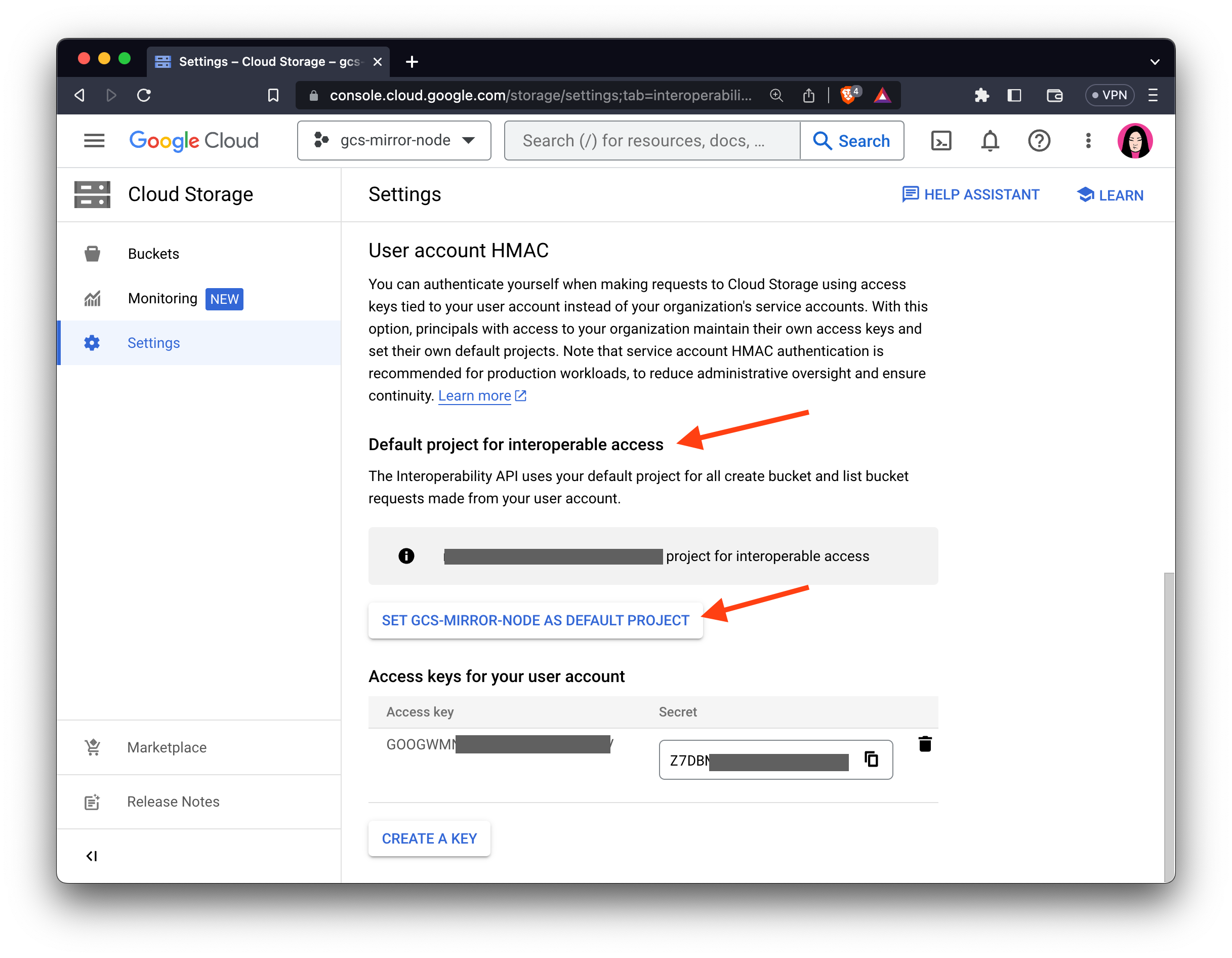 In this step, you will generate your Google Cloud Platform HMAC access keys. These keys are needed to authenticate requests between your machine and Google Cloud Storage. They are similar to a username and password. Follow these steps to retrieve your access key, secret, and project ID: