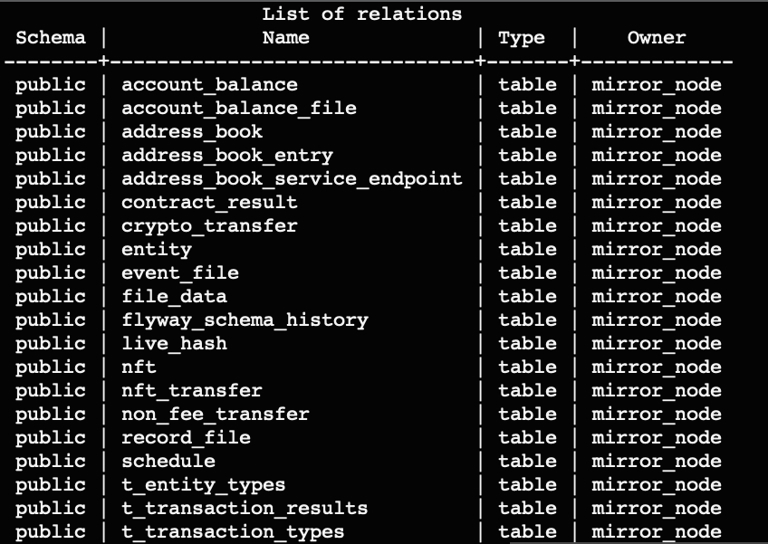 psql "dbname=mirror_node host=localhost user=mirror_node password=mirror_node_pass port=5432"