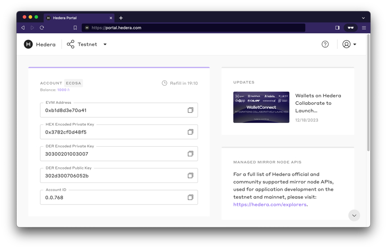 To create your Hedera Portal profile, register here and complete your profile. Once you’ve completed setting up your profile, select the test network (Testnet or Previewnet) from the network drop-down menu and create an account. After account creation, your portal account will automatically receive 1000 HBAR. You can easily copy your accountId, public key, and private key information to your clipboard to use when configuring your SDK environment for testnet.