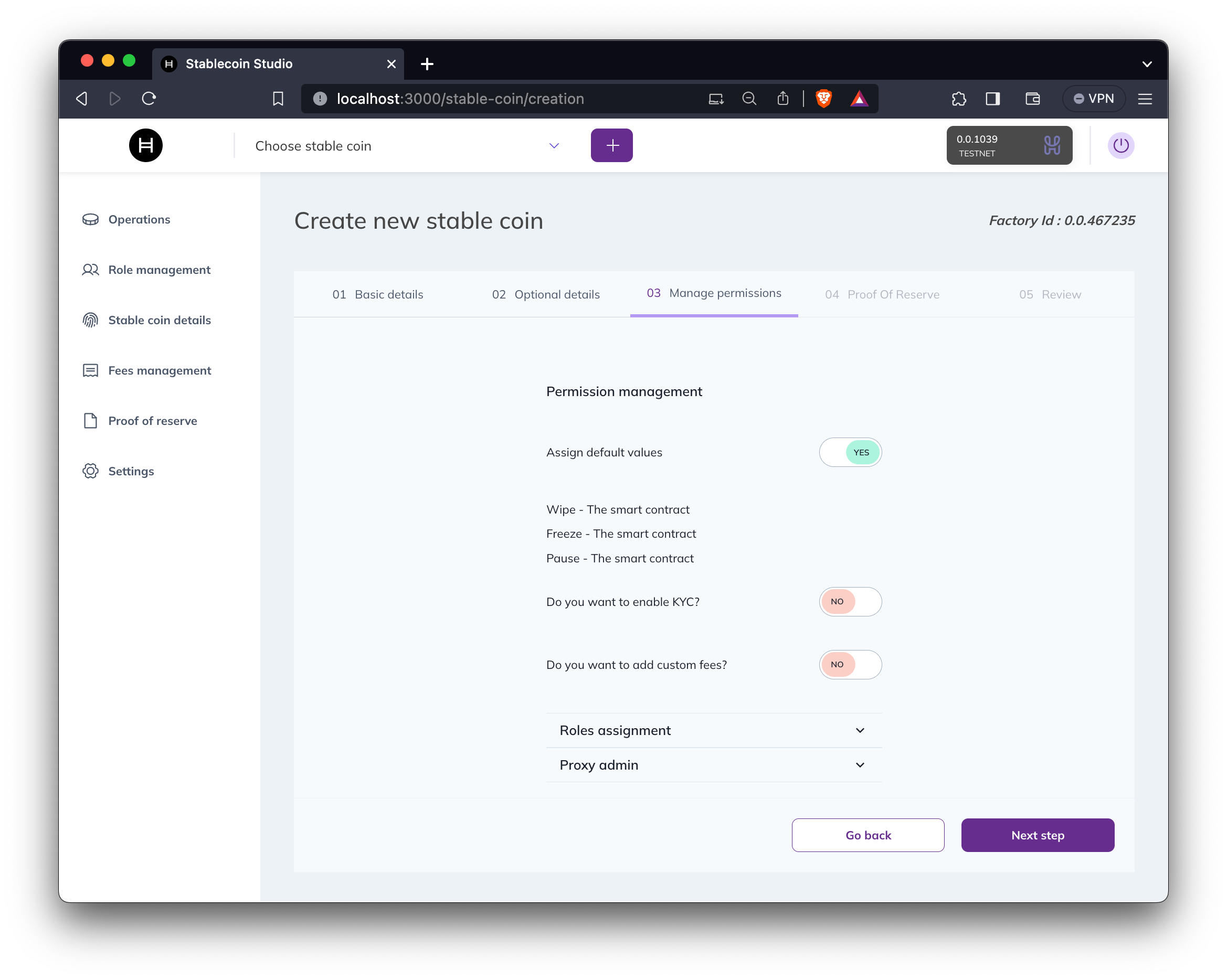 The Stablecoin Studio Web User Interface (Web UI) is designed to provide a more intuitive and user-friendly experience for managing stablecoins. Developed using React, this interface offers a visual representation of all our Web UI capabilities, from initial setup to advanced administration. Whether you’re a newcomer looking for an easier entry point or a seasoned developer seeking a more efficient way to manage stablecoins, this documentation offers the insights and resources to harness the full power of our React-based Web UI.